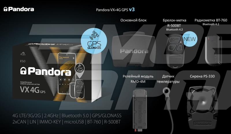 От предыдущей версии, Pandora VX 4G GPS v2, нынешнюю версию v3 отличает наличие двух SIM-карт - один SIM-чип впаян в базовый блок, а вторую карту в формате Nano-SIM можно установить любую по своему усмотрению. Помимо этого, обновленная система укомплектована новой моделью брелка ближнего действия R-500 BT.