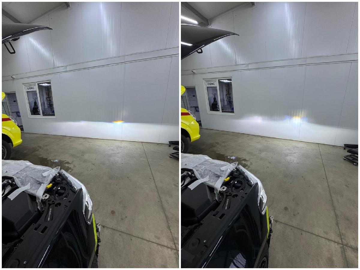 Как видим, различия в яркости светового потока - налицо, при этом присутствует четкая светотеневая граница. Перестроенная фара не светит размазанным прожектором во все стороны, ослепляя встречный поток - потому что используется не простая, обычная светодиодная лампа ненаправленного свечения, а именно линзовый модуль, аналогичный по конструкции оригинальному.